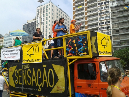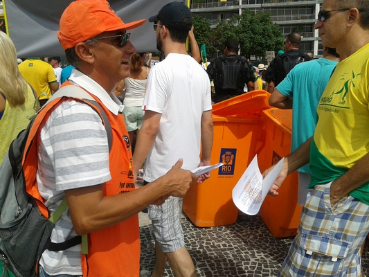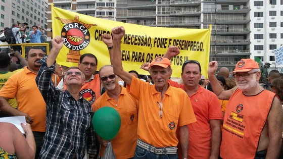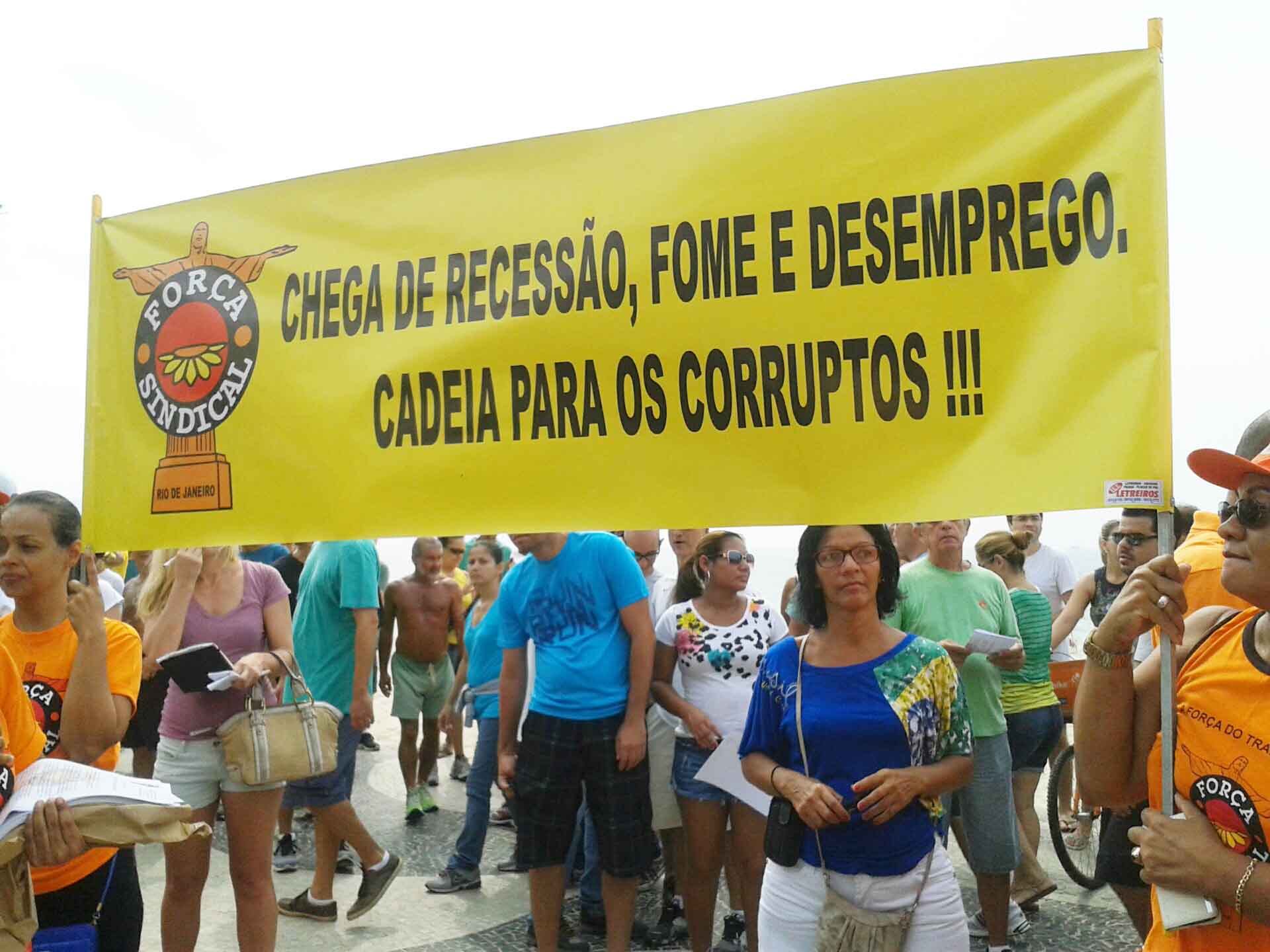 A Força RJ foi pra rua e juntou-se a milhares de manifestantes na orla de Copacabana, zona sul do Rio de Janeiro, na manhã de domingo (15). Entre camisas verde e amarelas, execuções frequentes do Hino Nacional, faixas, cartazes, apitaços e panelaços, dirigentes sindicais levaram seu grito de apoio à insatisfação popular, pedindo punição aos corruptos, mais empregos e respeito aos direitos trabalhistas.