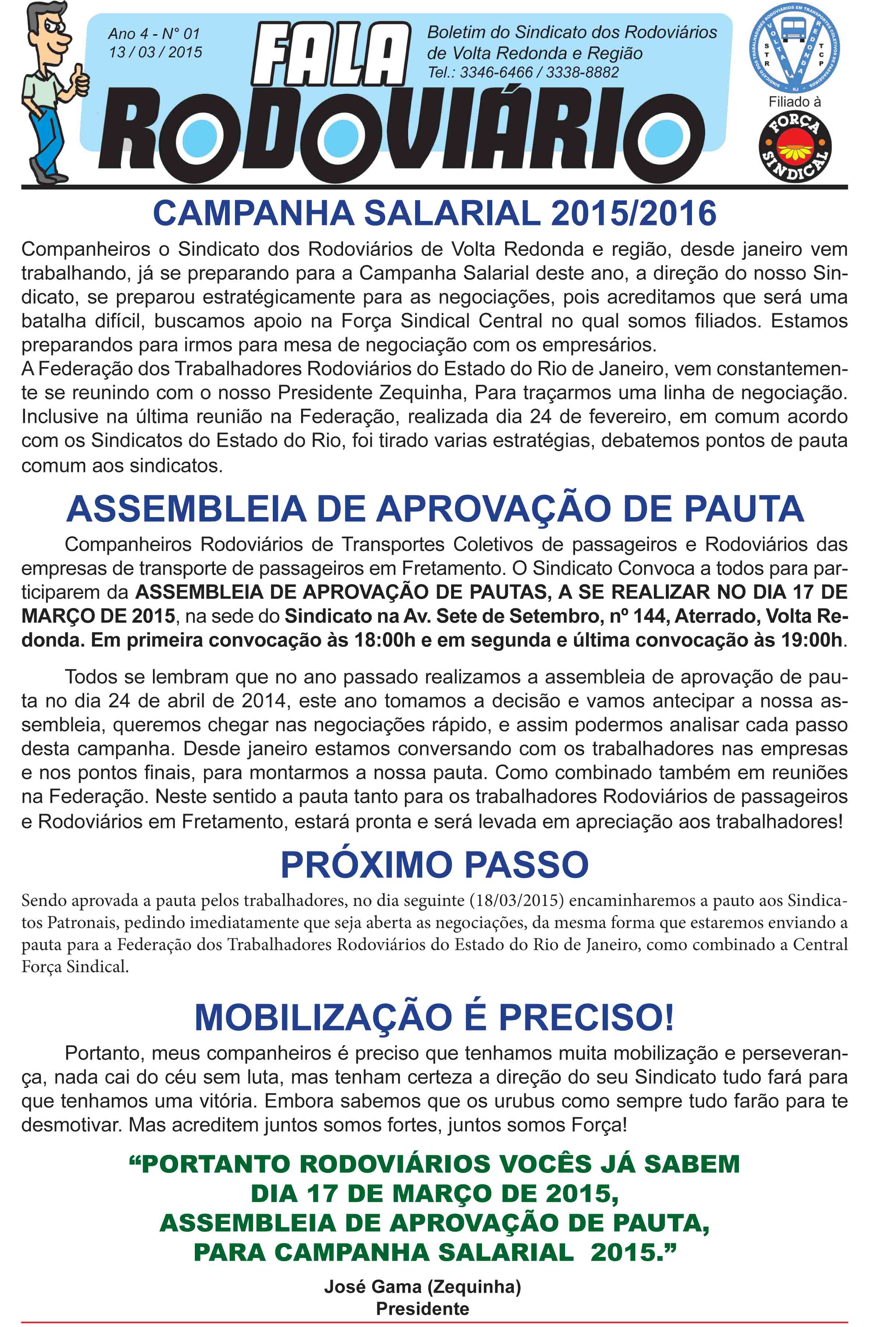 A data base é 1º de junho, mas desde janeiro o Sindicato dos Rodoviários de Volta Redonda e Região trabalha para construir as bases da campanha salarial 2015/2016. A primeira região com os sindicatos filiados à Federação dos Trabalhadores Rodoviários do Rio de Janeiro aconteceu em fevereiro e o presidente do Sindicato dos Rodoviários de Volta Redonda, José Gama, acredita que ainda em março será enviada aos patrões a Pauta de Reivindicações da categoria.